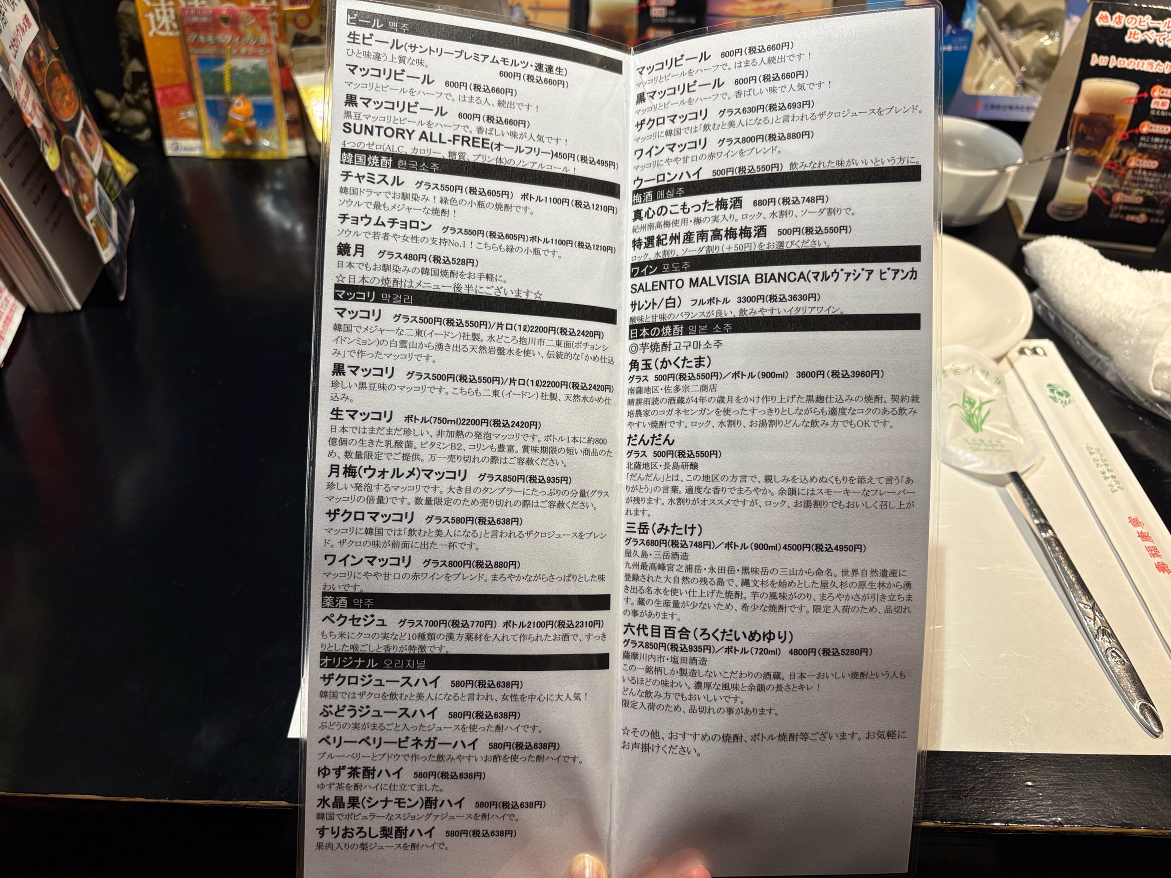 チャミスルやマッコリなど、定番の韓国酒から日本の焼酎まで多数取り揃えているため、お酒好きにはたまらないのではないでしょうか?