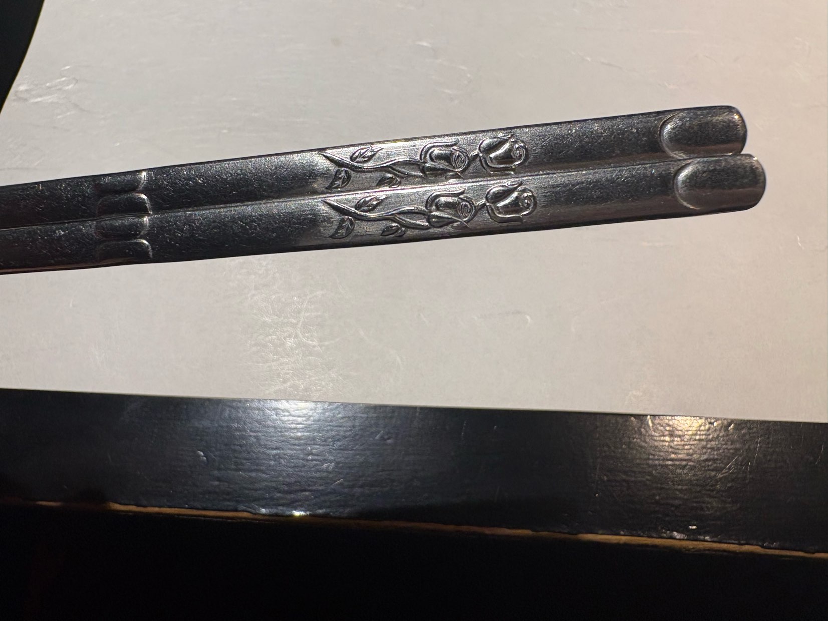 日本の飲食店でよく目にする木製や竹製の箸とは異なり、銀色の箸とスプーンが用意されています。バラの彫刻が目を引きますね。