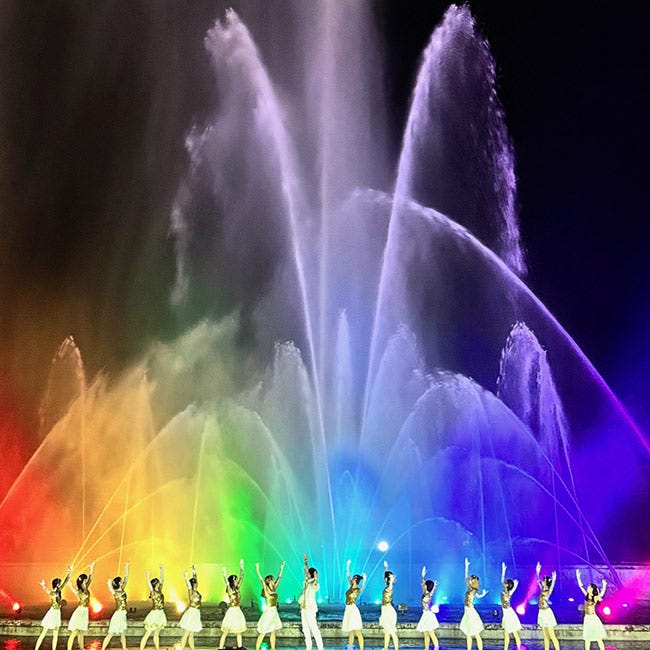 夜空を飾るレーザーの光、それに合わせて動くパワフルな噴水…。水と光と音が織りなすダイナミックで華やかなパフォーマンスをぜひ鑑賞して。