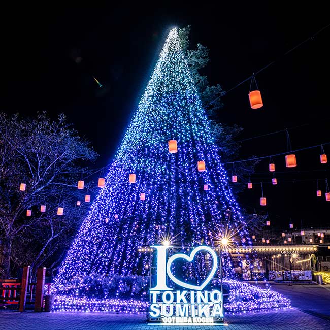 高さ約20mのシンボルツリーは、装いも新に“富士山”をイメージしたデザインに衣替えをしたのだそう。大きさデザインともに壮大で、夜空にそびえるツリーは見応えたっぷり。フォトスポットとしても人気だから、ぜひ立ち寄ってみて。