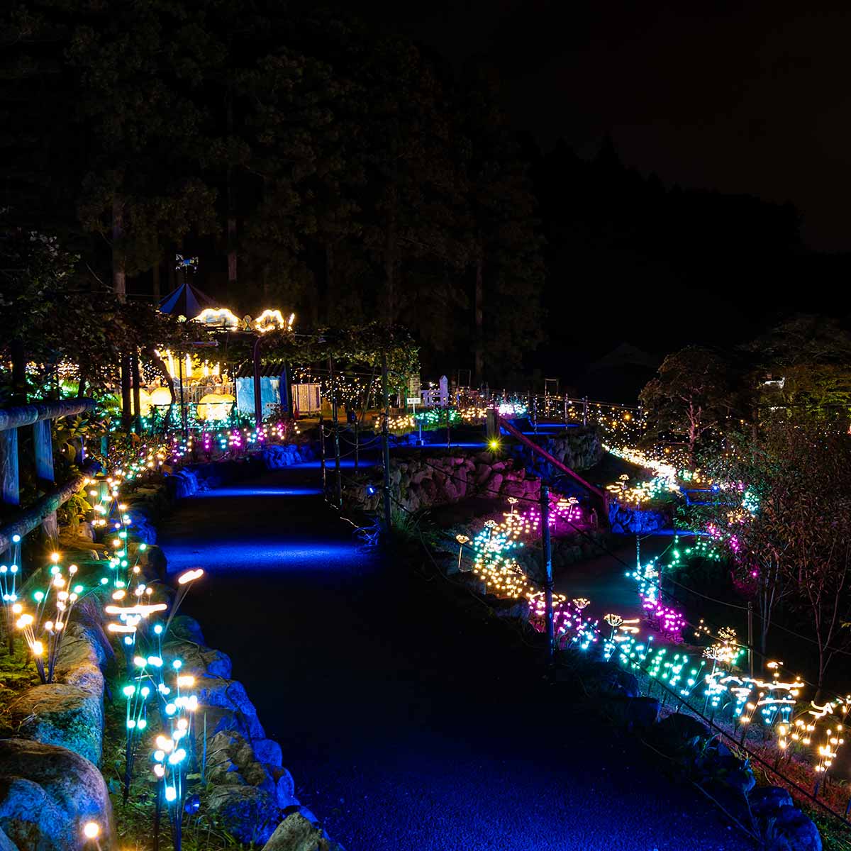 御殿場高原 時之栖では、2026年3月8日(日)まで、時之栖イルミネーション2025-2026「ひかりのすみか」を開催。「日本夜景遺産」に認定されたイルミイベントで、24回目を迎える今年は、昨年からさらにパワーアップ。「マジックフォレスト」をテーマに、約550万球もの光で幻想的な世界を表現している。富士山をイメージしたデザインに衣替えしたシンボルツリー、見応え満点の噴水レーザーショーなど、美しい光景にときめいて。