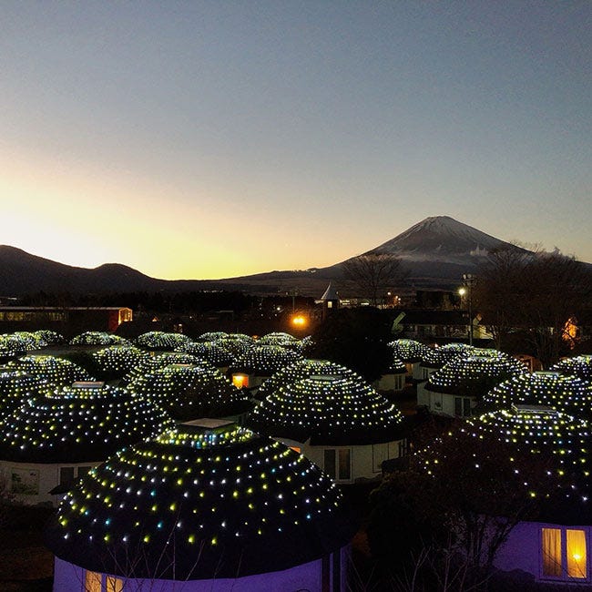 進んで行くと、光の海「スローハウストゥインクル」が出現。夕暮れ時を迎えれば、富士山とトゥインクルが織りなす極上の景色が一面に。高台から望む美しい光景に、息をのんでしまいそう。