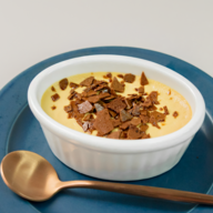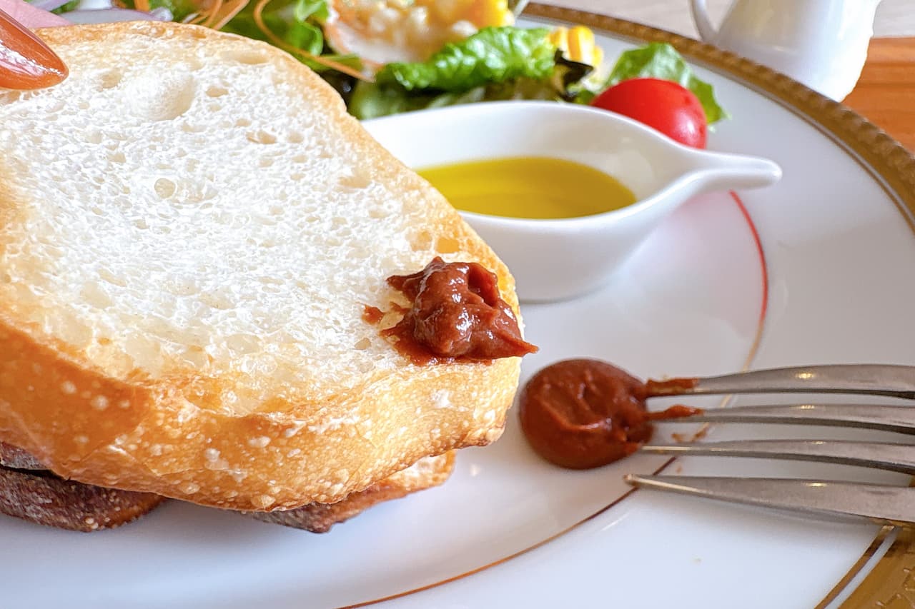 「自家製フランスパン」に自家製ヴィーガンチョコレートソースをつけていただきます。 自家製フランスパンの外はカリッと軽やかで、噛むとサクサクとする歯ごたえ。チョコレートソースのなめらかさが重なり、食感のコントラストを楽しめます。 チョコレートソースには米麴が入っているためほのかに酸味がアクセント。甘さのなかに爽やかさが感じられる後味のいい一品です。