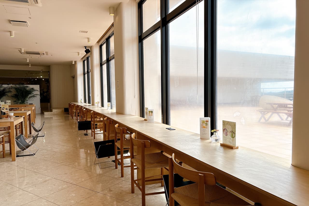 取材日はあいにくの曇り空。けれど、雲の隙間からこぼれるかすかな陽の光が店内をやわらかく照らしていました。 店内には心地よい音楽が流れ、白を基調とした空間にウッド調の椅子とテーブルが温もりを添えています。 深く腰を下して、大きく広がる空を見上げると、胸の奥まで明るくなるような開放感がありました。