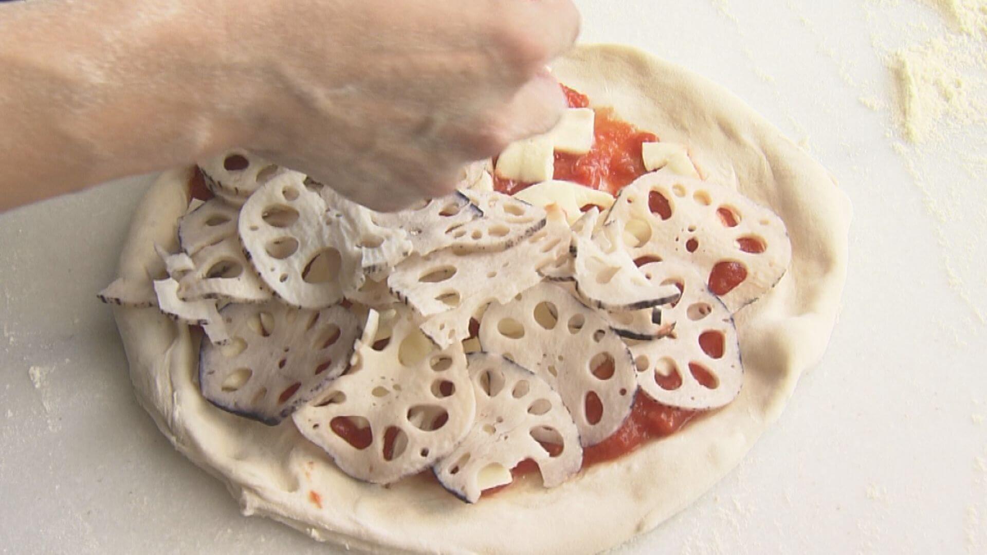 本場イタリアの技術が詰まった生地の上に、地元・大和町の特産品である大和レンコンがたっぷりのせられていきます。