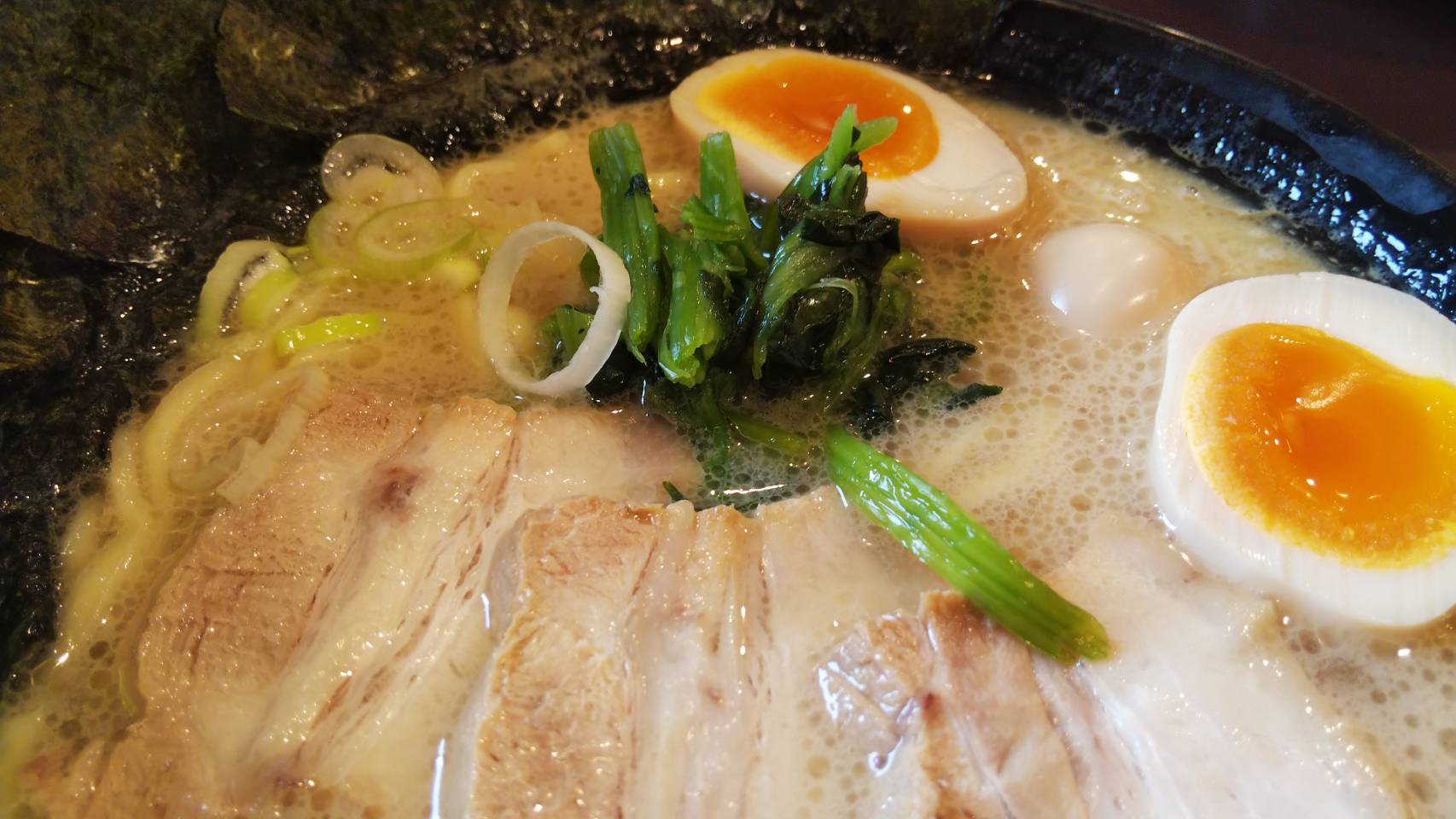 白濁したスープの上に浮かぶ厚切りチャーシュー、鮮やかなほうれん草、そしてとろりと輝く半熟味玉。丼をぐるりと囲む大きな海苔が、まるで船の帆のように存在感を放つ。