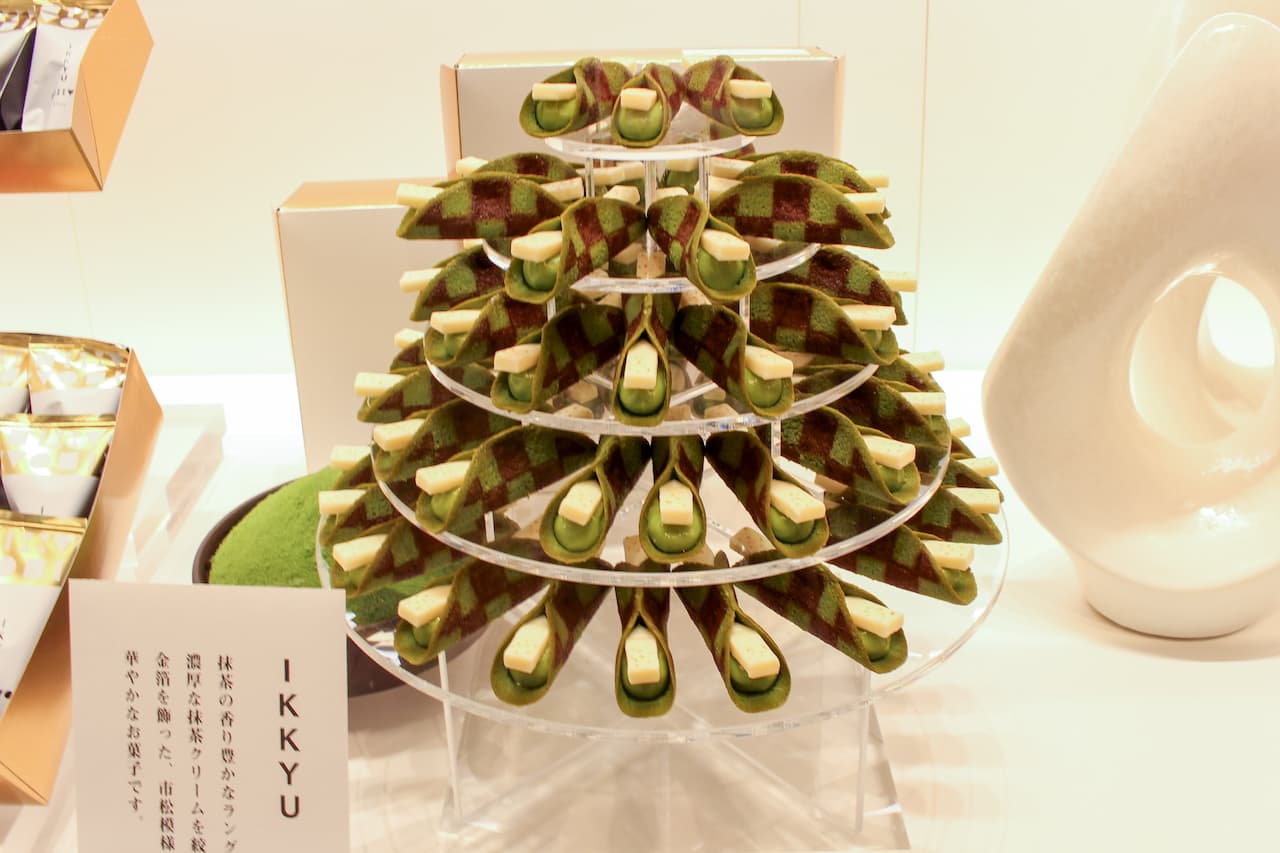 格子模様のラングドシャでホワイトチョコレートと抹茶クリームを包んだ看板商品「IKKYU」のほか、生チョコレートなど、ここだけの逸品が並びます。