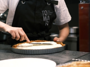 店名の「TOWARI」は「十割=100%」を意味し、粉から生地を仕込む1から10までの“手仕事”を表現した。さらに、フランス語の「toi(あなた)」の響きを重ね、本場感と親しみやすさを込めたという。素材と製法にこだわり、タルト好きも驚く“本物の味”を追求した。