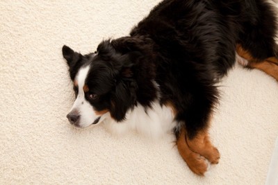 犬が横向きに手足を伸ばして寝転がっているのは、満足しているときにみせるサインです。