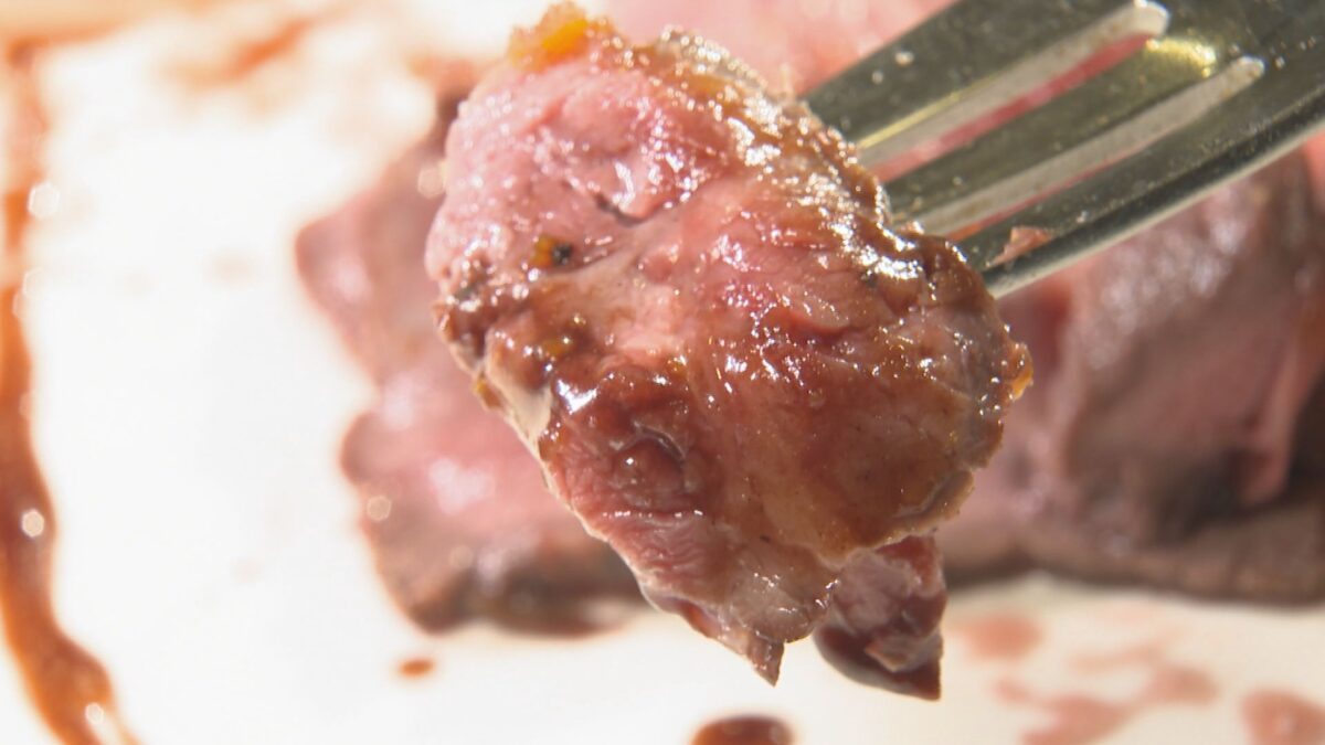 ナイフを入れると、その柔らかさに驚き、プルンプルンと震えるほど。持ち上げるのも慎重になるほどの柔らかさです。ご主人が「飲めるハンバーグとも言われます」とおっしゃる通り、ふわっとした食感の後、次の瞬間には口の中で形をなくし、とろけて溶けていくような極上の口どけなんです。