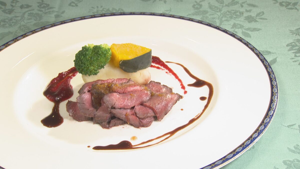 そして肉料理は、美しいロゼ色の秋吉台高原牛の赤身を使ったローストビーフ。赤ワインを使ったポルトソースがかけられています。このお肉とソースの組み合わせも秀逸。さっぱりとしているのにコクがあるソースが、赤身肉と最高の相性を見せます。ある程度の歯ごたえを残しつつ、くどくない後味は、秋吉台高原牛の実力を存分に見せつけられる一皿でした。