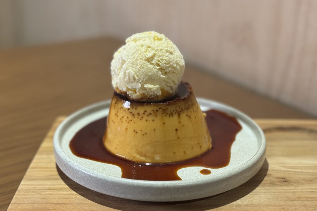 弾力のある固めプリンは滑らかな食感が心地よい。卵の風味が濃厚でエスプレッソが隠し味のキャラメルソースと相性抜群。溶けたアイスクリームの甘みが全体を包み込みます。