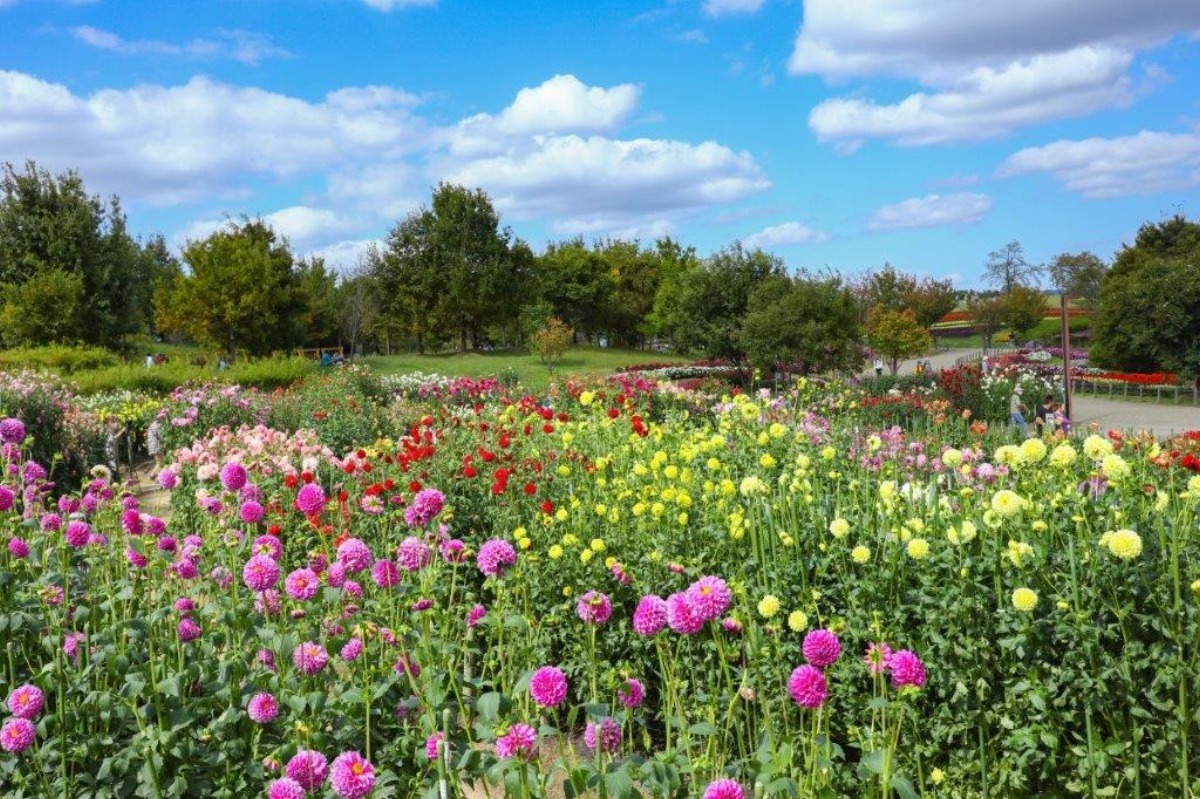 9月下旬から11月にかけて、約120品種1,000株のダリア、約11万本のコスモスなど秋の花々のほかに、茜色に紅葉したコキアなどが出迎えてくれる馬見丘陵公園。
