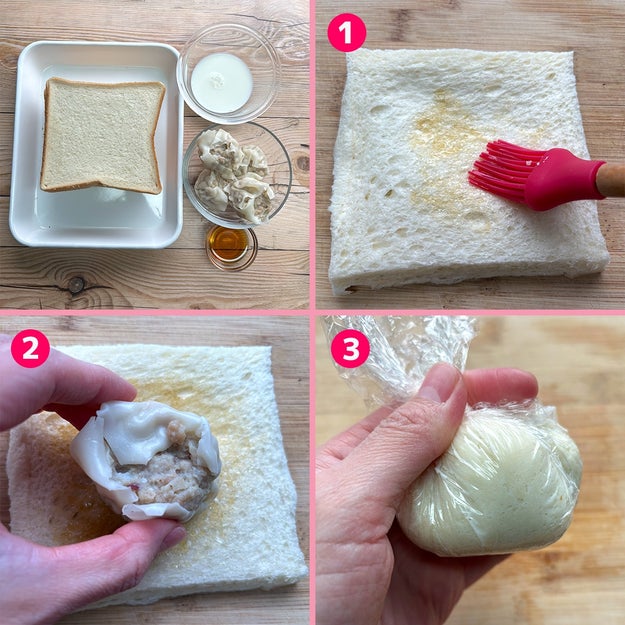 牛乳を染みこませた食パンにごま油を塗り、市販のシュウマイを包んでレンジでチンするだけ。外はふわもち、中はジューシーで「これほんとに食パン!?」ってなるやつです。