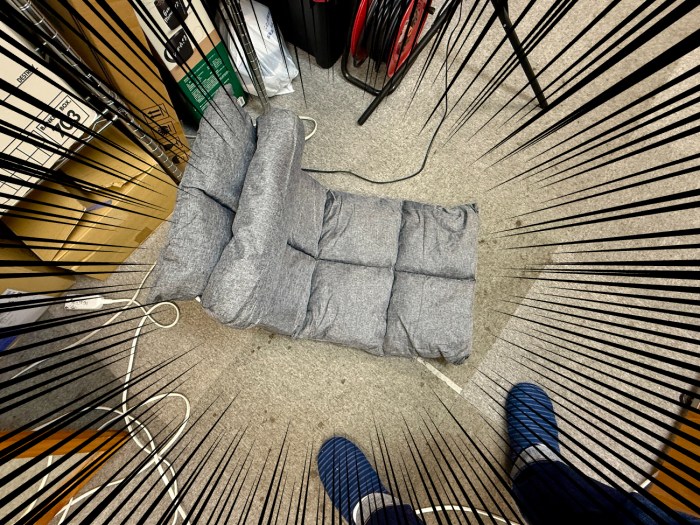 とにかくソファがないと休憩ができない。ってことで、Amazonで「座椅子 1人掛けソファ ゆったりワイド 大きい 肉厚クッション〜(1900円)」なる商品を購入した。