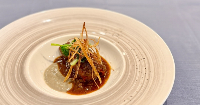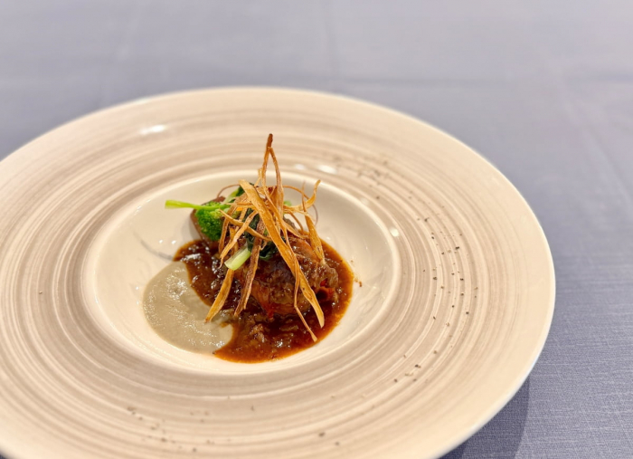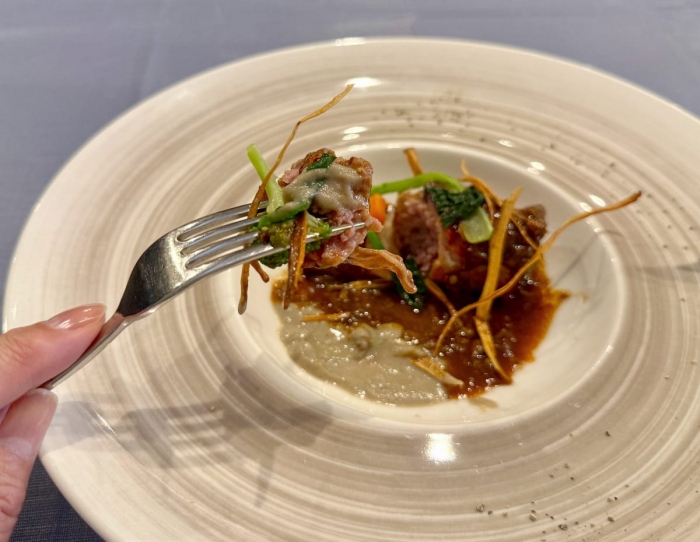 メインの肉料理は「ベーコンを巻きつけたパテ ハッシュドビーフ煮込み」。