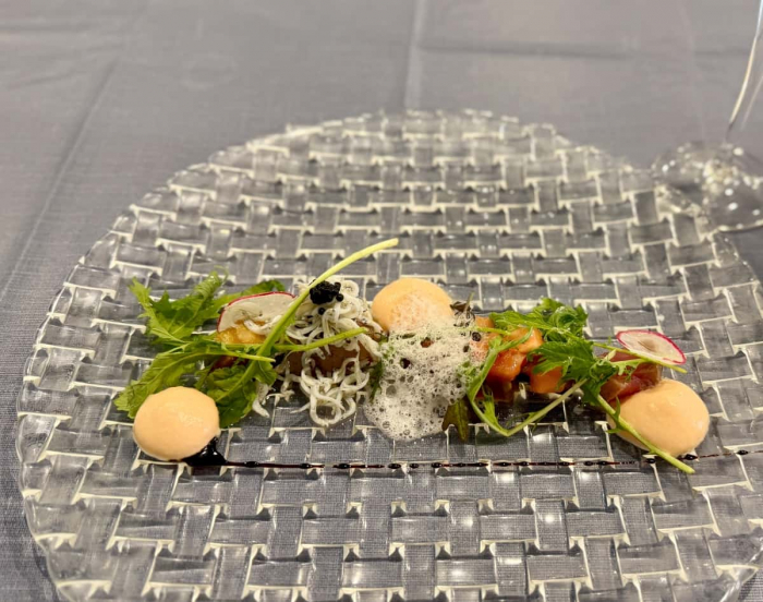 前菜は新鮮な鰹としらす、軽くビネガーを効かせたナスとフレッシュトマトでサラダ仕立てに。しらすの自然な塩味を生かした味つけがやさしく、後味がさっぱりとしています。