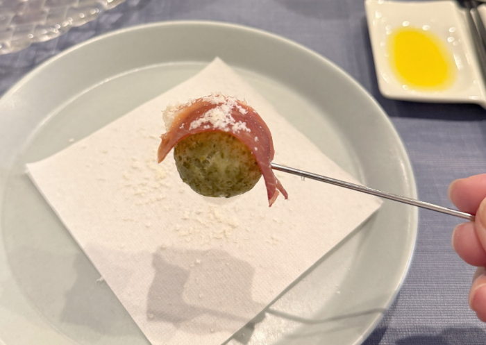 コースが始まる前にいただく小さなおつまみ【アミューズ】から食事はスタート。ピザ生地に海藻を混ぜて揚げた「ゼッポリーネと生ハム」は磯の香りと生ハムの組み合わせが絶妙です。