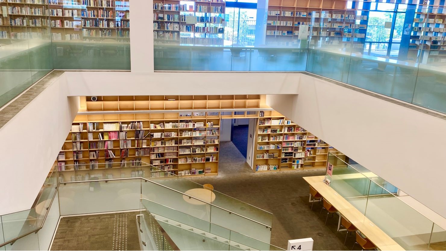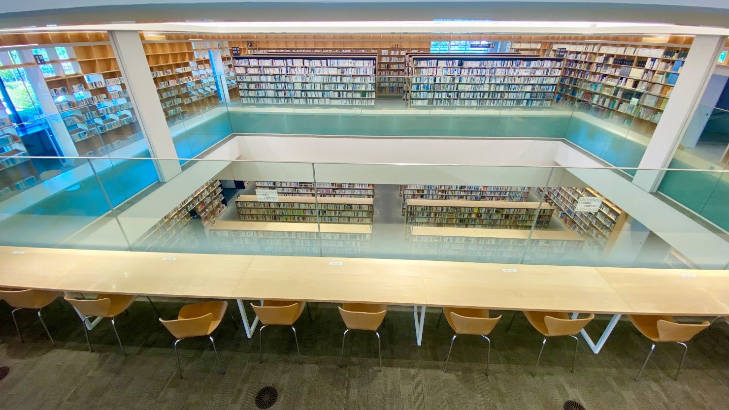 こちらは4階の吹き抜けに面したカウンター席からの眺めです。ずらりと並ぶ階下の書架はまるで本の森。利用者からの人気も高い電源が使用できるカウンター席からは、ゆいの森あらかわならではの眺望を満喫できます。