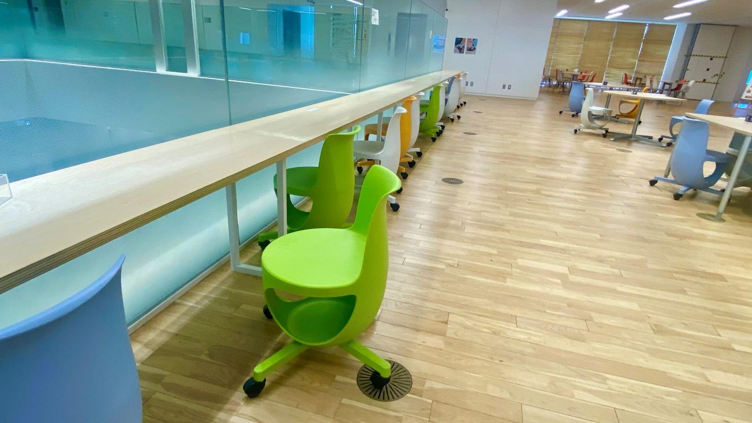 最上階の5階フロアには、「コミュニティラウンジ」が広がります。洗練されたオフィスのような空間は、椅子やテーブルを自由に動かして利用者同士がコミュニケーションを交わせるスペース。飲食が可能なため、1階にあるカフェでテイクアウトしたものや持参した食事もこちらでいただけます。