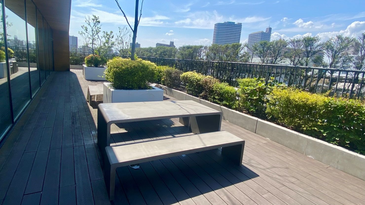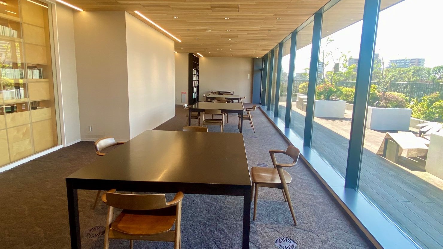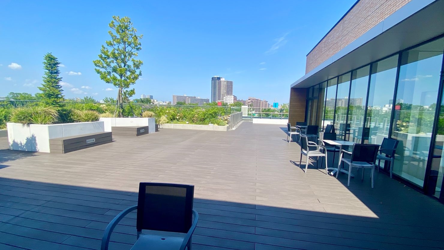 4 階の北側に造られたテラスには読書席が用意されています。天気の良い日には屋外で読書を満喫できます。周囲に高層ビルがないため、大きな青空を感じられるスポットです。