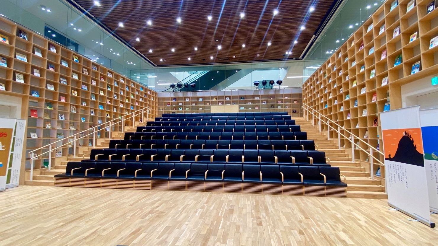 壁面に飾られている本はすべて絵本です。子どもから大人まで誰もが読むことができ、すべての世代を結ぶ絵本に囲まれているホールは、ゆいの森あらかわの理念を体現しているような場所です。ホールでイベントがない時にはホールの中は閲覧席として利用できます。