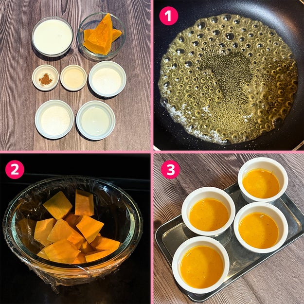 ① フライパンに【A】を入れて中火で熱し、カラメル色になったら耐熱容器に1/4量ずつ流し入れる。