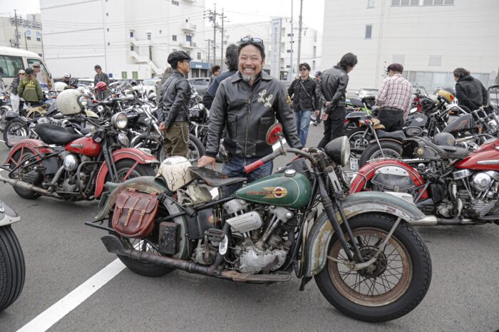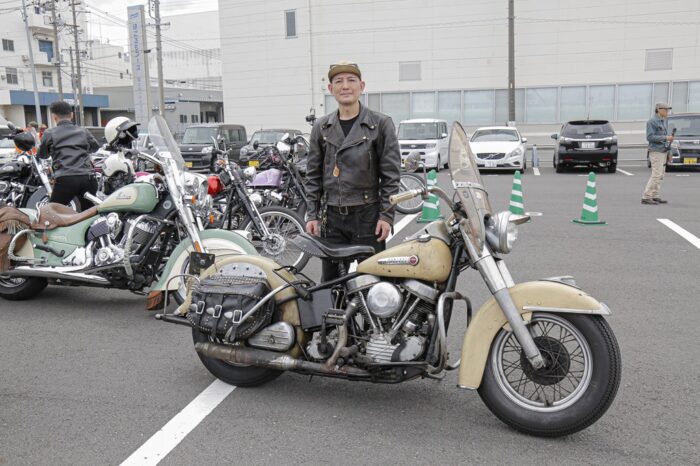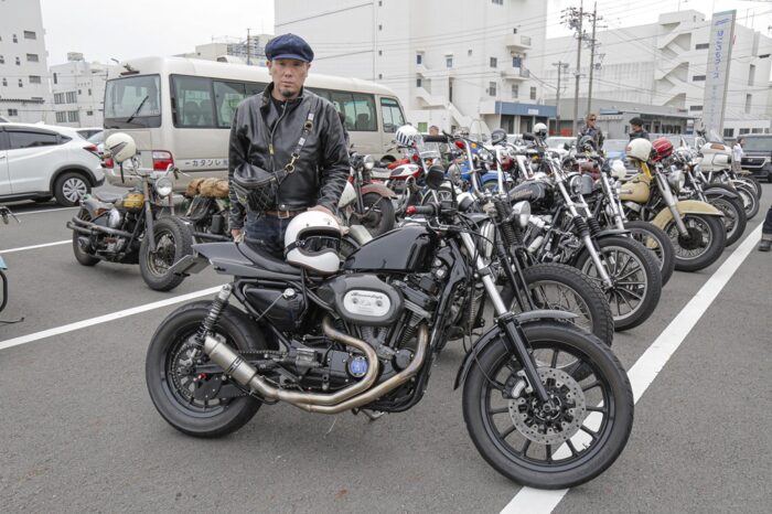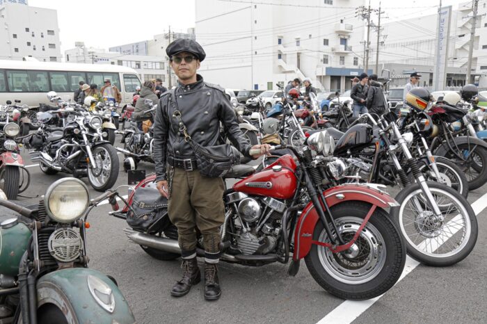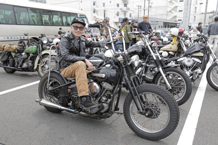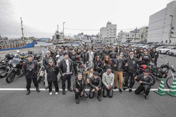 H-Dを中心に新旧入り混じる車両が自走参戦。ナックルヘッドやフラットヘッドなどのヴィンテージから、スピードクルーザー、フルスクラッチまで、ラングリッツのレザーを纏い百花繚乱のバイク乗りが集った。目的地は清水の魚市場「河岸の市」。清水漁港で獲れた新鮮な刺身や海鮮丼が食べられる。自慢のバイクで集って、美味しい地物を目指す。革ジャンを着て、ハーレーで走る理由はそれだけで十分だ。
