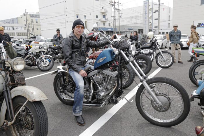 超希少なファーストイヤー ナックルヘッド乗りの石井さんは、革のチョイスにもセンスが光る。ラングリッツのフライトジャケットにレザーパッチやAMAパッチを貼り付けたカスタムに愛着がにじみ出る。