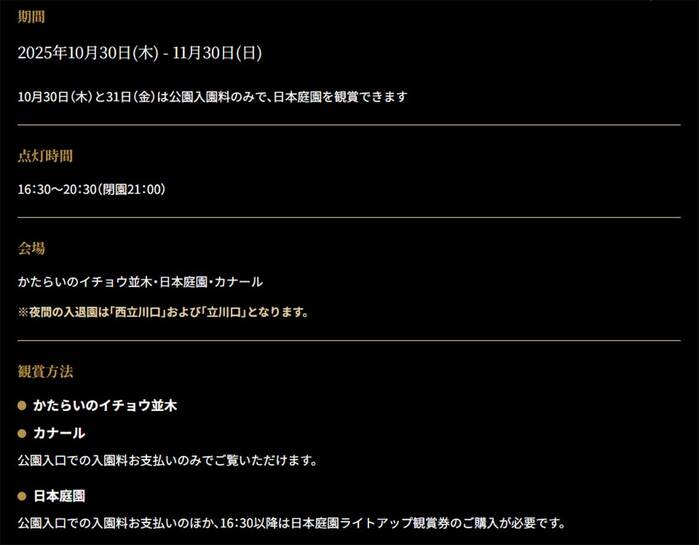 かたらいのイチョウ並木・カナールのライトアップは、通常の入園料のみで観覧可能、