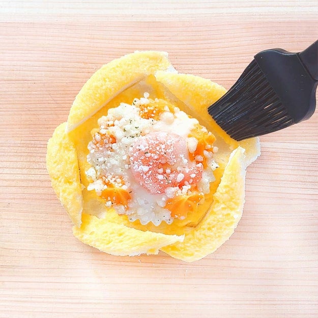 ③ ②の切り込みを内側へ折りたたむ。冷凍エビグラタンのせて、溶き卵を塗る。トースターでこんがりするまで焼いたら、完成!