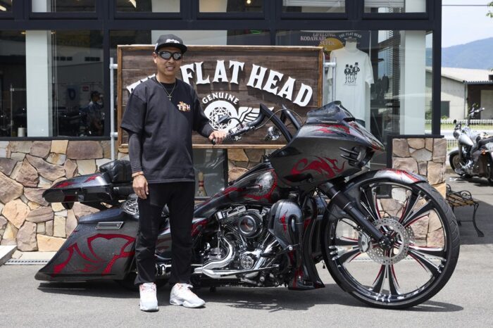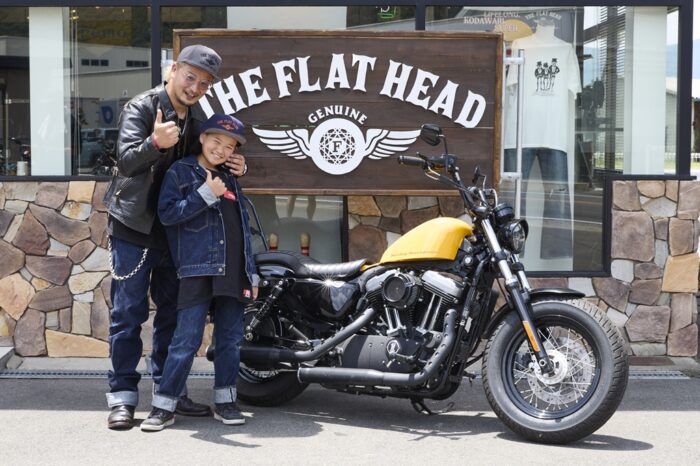 フラットヘッドのスタッフ・坂口さんは、愛娘の陽波ちゃんと一緒に参加。黄色いタンクを引き立てるため、クロムパーツをブラックに換装。また、コブラシートとシッシ―バーは「娘とツーリングがしたくて」と装着したという愛情装備。父娘そろってフラットヘッドのアイテムを身にまとった、リンク感ある親子コーデも印象的だった。