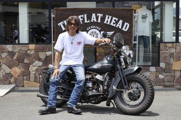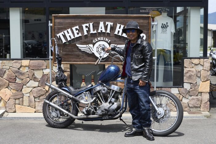 全身フラットヘッドでまとめ、雰囲気あるコーディネートを披露してくれた両角さん。インナーとデニムのブルーがバイクの外装とも調和し、統一感ある着こなしが洒落ている。シッシ―バーは60年代のヒッピーが使っていた当時モノで、悪魔の尻尾のような独特の造形がお気に入り。特注した6ベントのハンドルも存在感抜群。