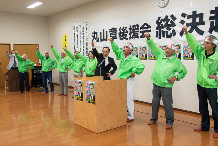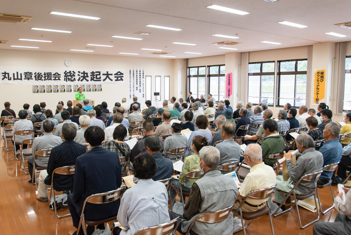 任期満了に伴う上越市長選(10月19日告示、同26日投開票)に立候補を表明している無所属新人で上越市議の丸山章氏(71)の後援会は2025年10月5日、同市清里区武士の清里活性化交流施設で総決起大会を開いた。約100人(主催者発表)が集まった。
