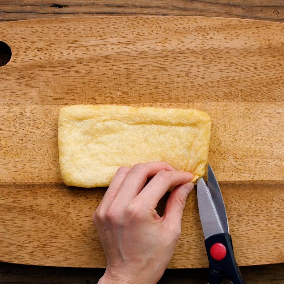 1: 油揚げは3辺に切り込みを入れ、開きます。