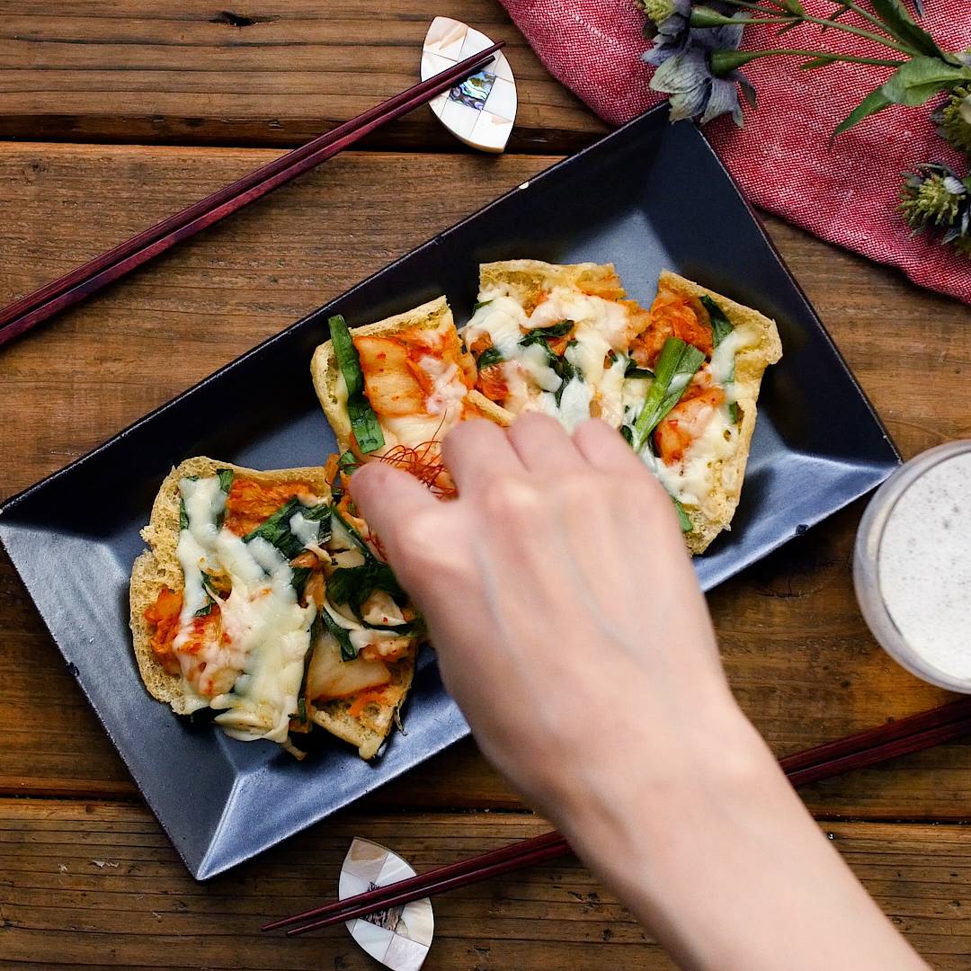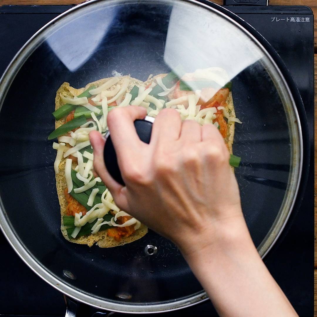 3: 裏返してキムチ、ニラ、チーズをのせ、フタをして弱中火で3分ほど焼きます。