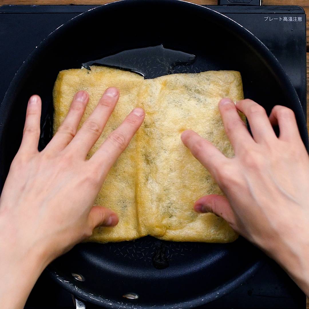 2: フライパンにごま油を引き、開いた面を下にして油揚げをのせて焼きます。