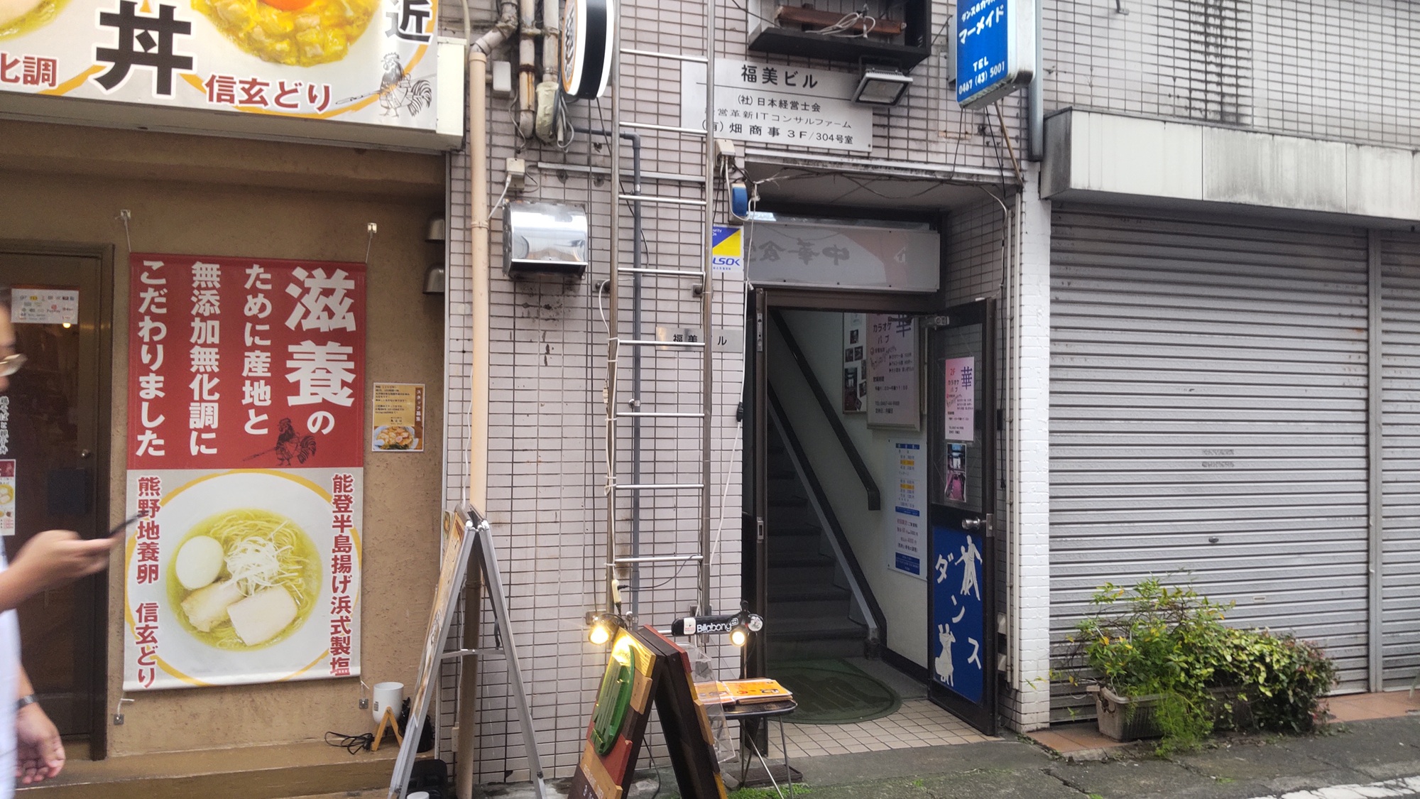 お店の入口へは、商店街沿いのラーメン屋「鶏左近」さん横の階段を使いましょう。2階へ上がると、左手すぐに入口があります。
