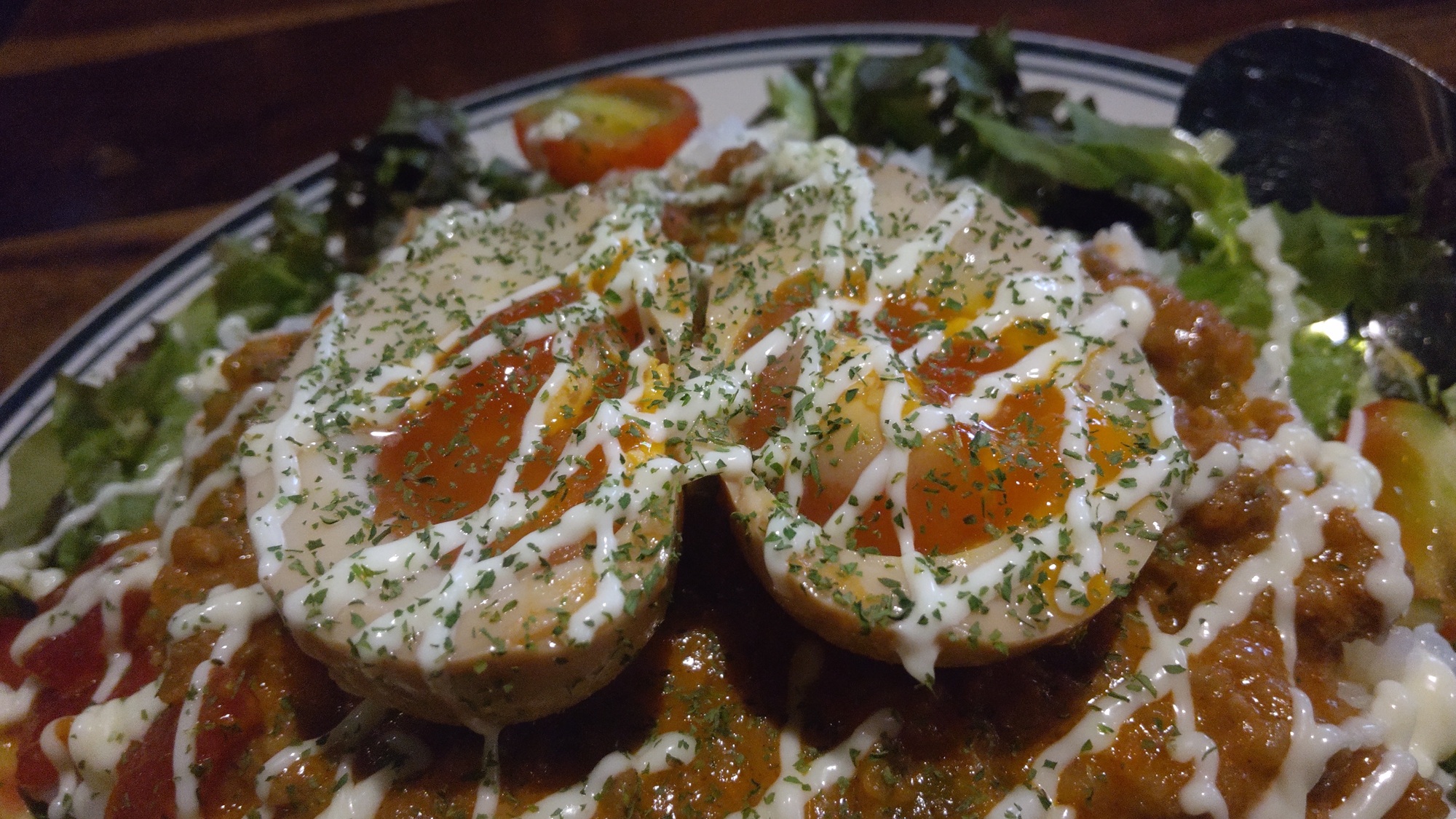 この煮卵が、すごくいい仕事をしてくれていました。温泉卵を乗せたタコライスはどこかで見たことがありますが、「煮卵」はありそうでない組み合わせです。