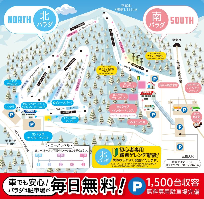 佐久スキーガーデン「パラダ」の魅力は価格だけではありません。上信越道の佐久平パーキングエリアに直結しているため、車でのアクセスがとっても便利!長野県内だけでなく、関東圏からのアクセスも抜群で、気軽に日帰りスキーやスノーボードを楽しめます。