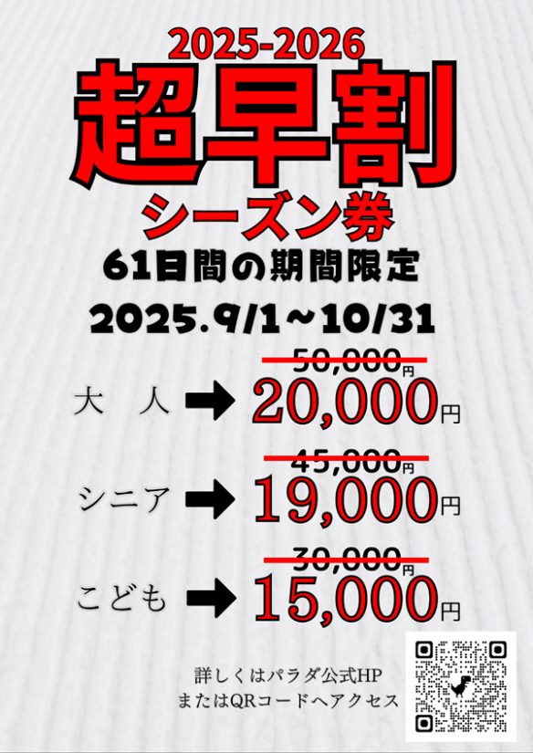 2025-2026シーズンの「超早割シーズン券」は10月末までの限定販売。通常では考えられない価格でシーズン券が手に入るこの機会を、ぜひお見逃しなく!