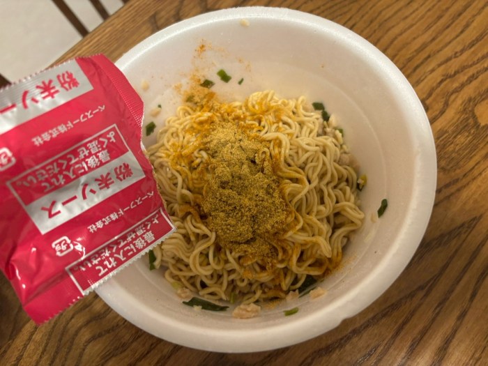 湯切り後に特性油、粉末ソースの順で混ぜていくと……。