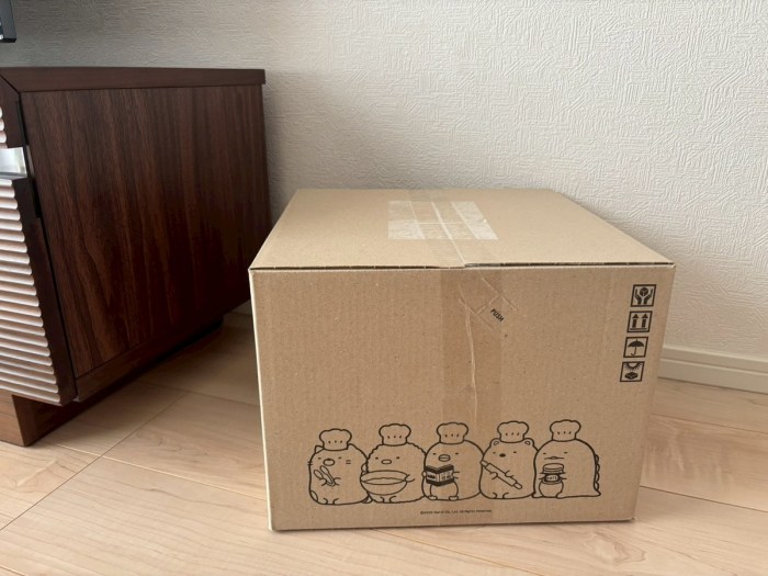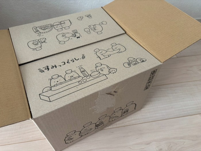 あら、段ボールがすみっコぐらしデザインだ。