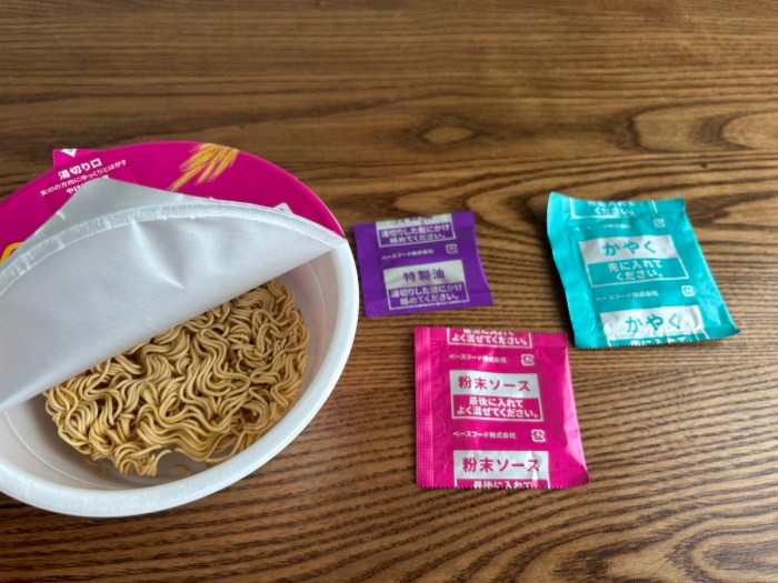中に付属しているのは「かやく」「粉末ソース」「特製油」。