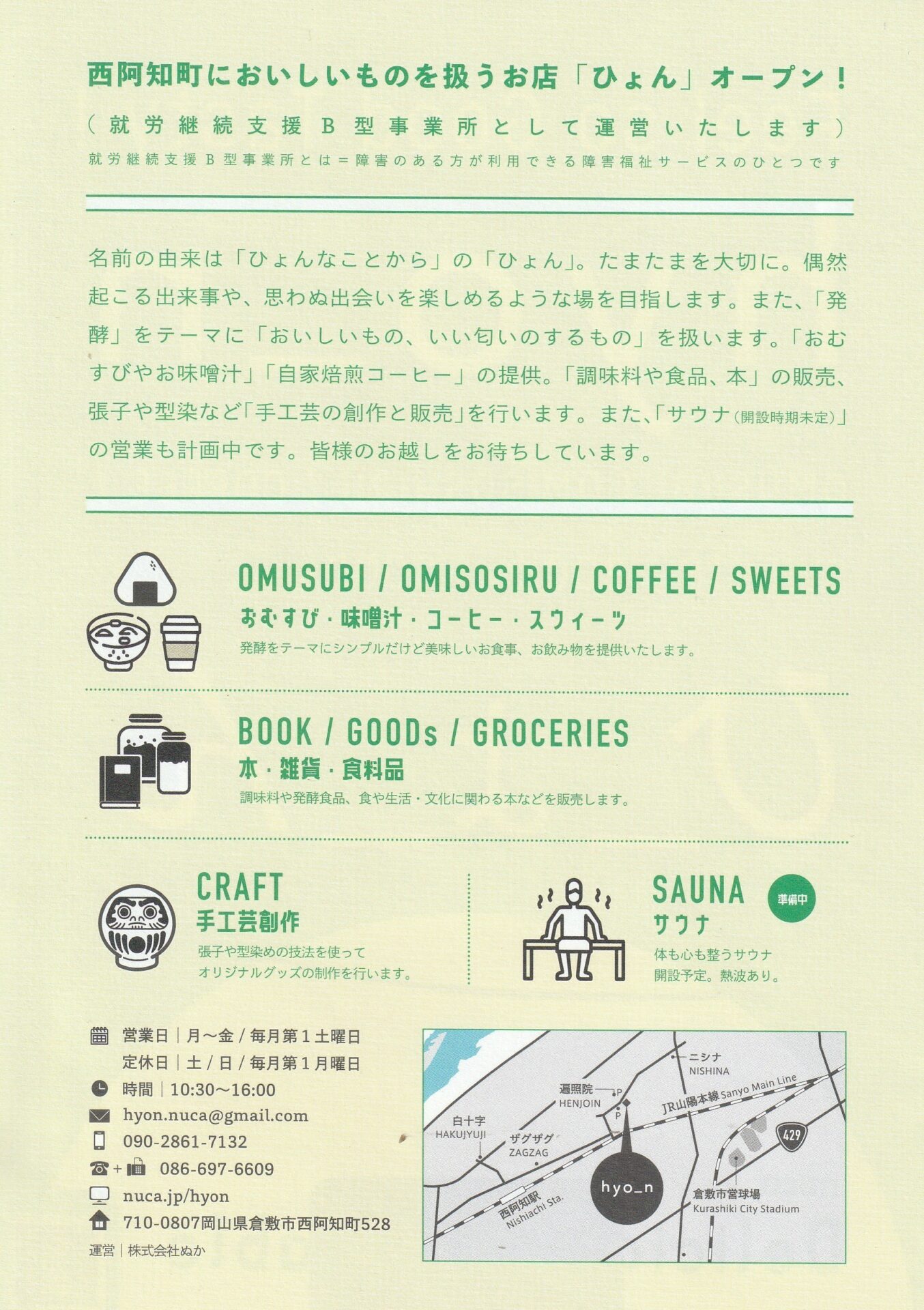 「ぬか」がおこなう事業のうち、この記事では、2024年に倉敷市で始まった就労継続支援B型事業所「ひょん」を中心に紹介します。