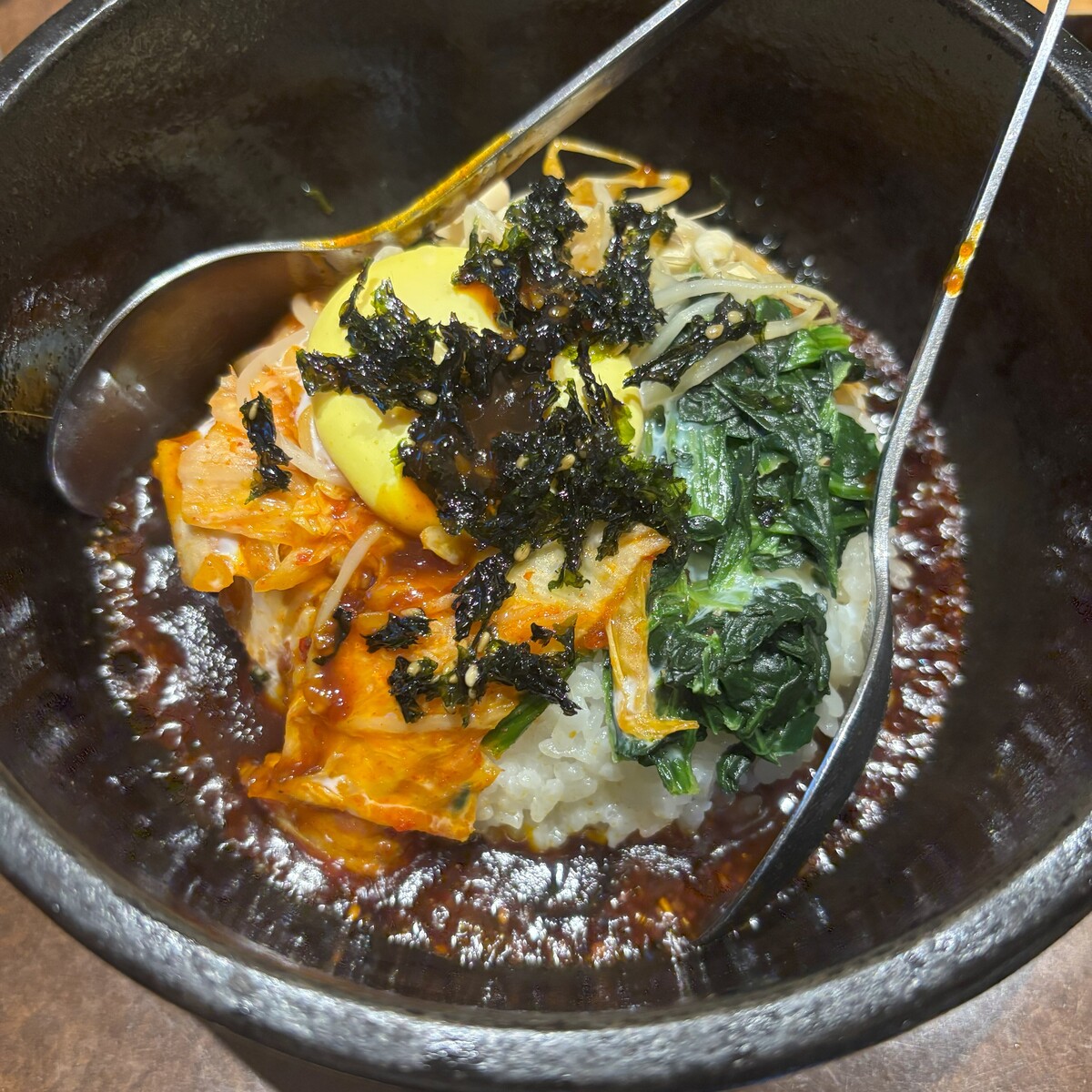 コクのある甘辛いコチュジャンにピリ辛キムチ、ほうれん草&もやしのナムル、半熟卵を割るととろ~り。混ぜるとゴマ油の香ばしさとカリっとしたおこげもたまらない。