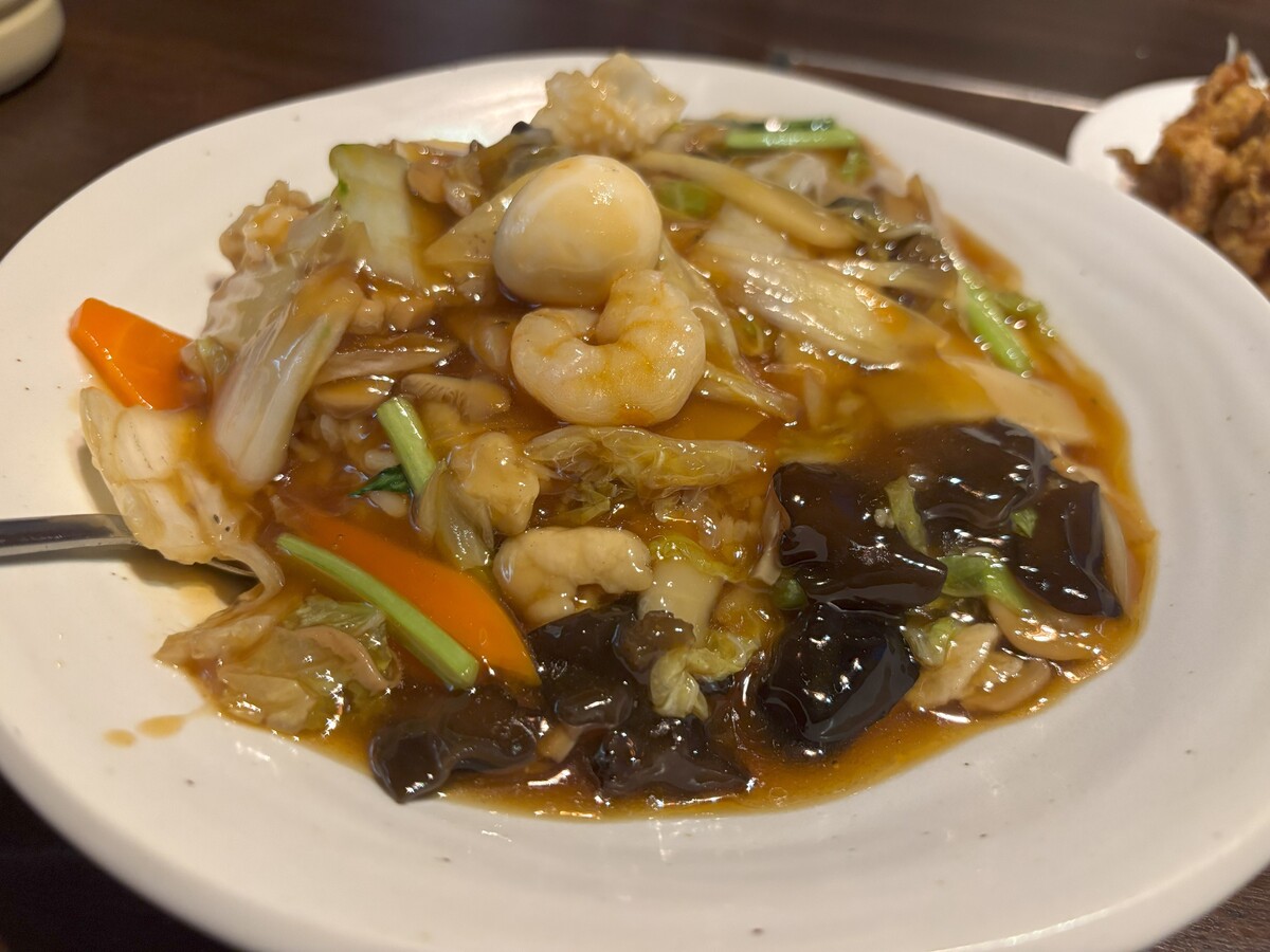 シャキッとした野菜や海鮮もたっぷりと入っていて、とろみのある熱々のあんは、鶏ガラやオイスターソースの味付けがしっかりとされているので味に深み、コクがあり食感もいいですね~。