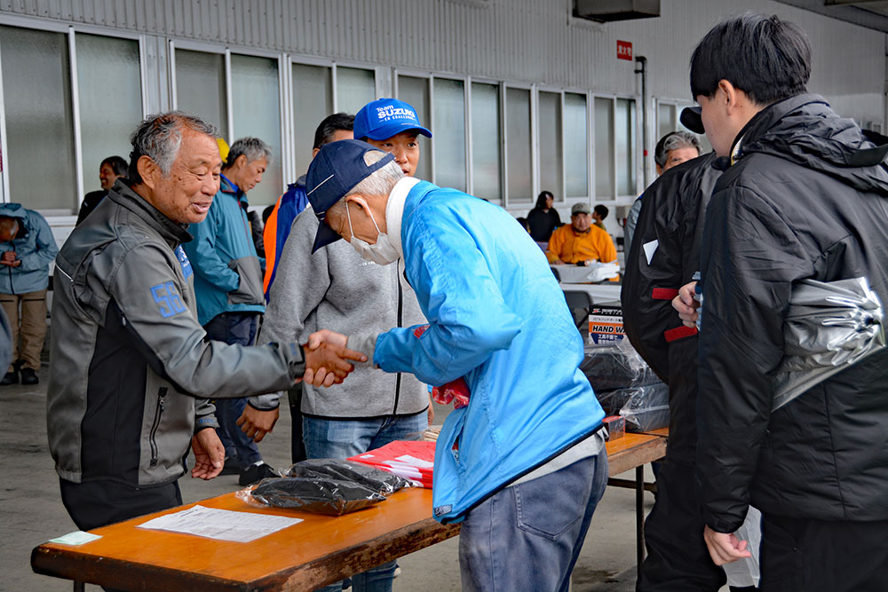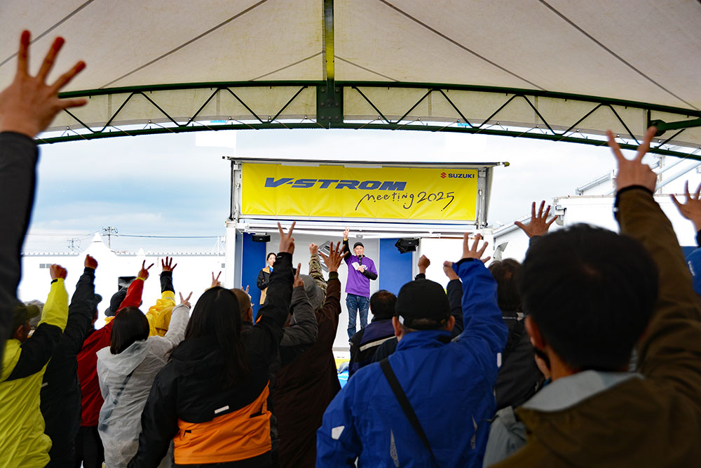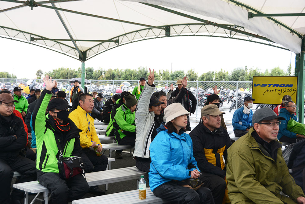 Vストロームの「V」を数字の「2」に置き換え、名前に「二(漢数字)」が使われている来場者に景品が当たるVストロームミーティングならではの抽選会が実施されました。MCの浜崎 美保さんからの「名前に数字の“二”が入っている方はいらっしゃいますか?」という問いかけに、会場から続々と挙手が。幸運な当選者は景品を手にしていました。