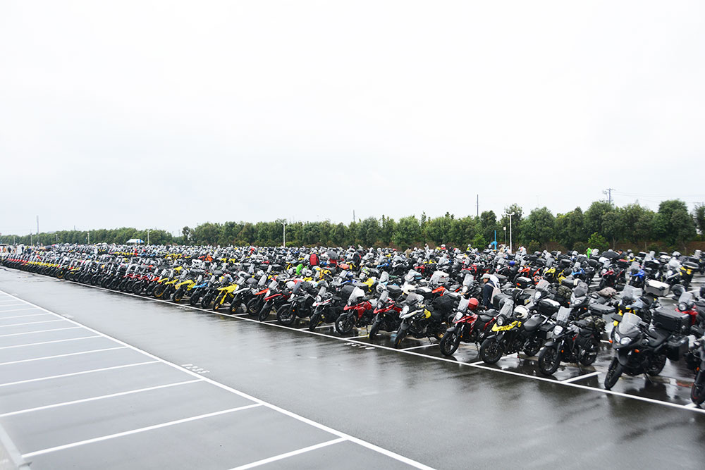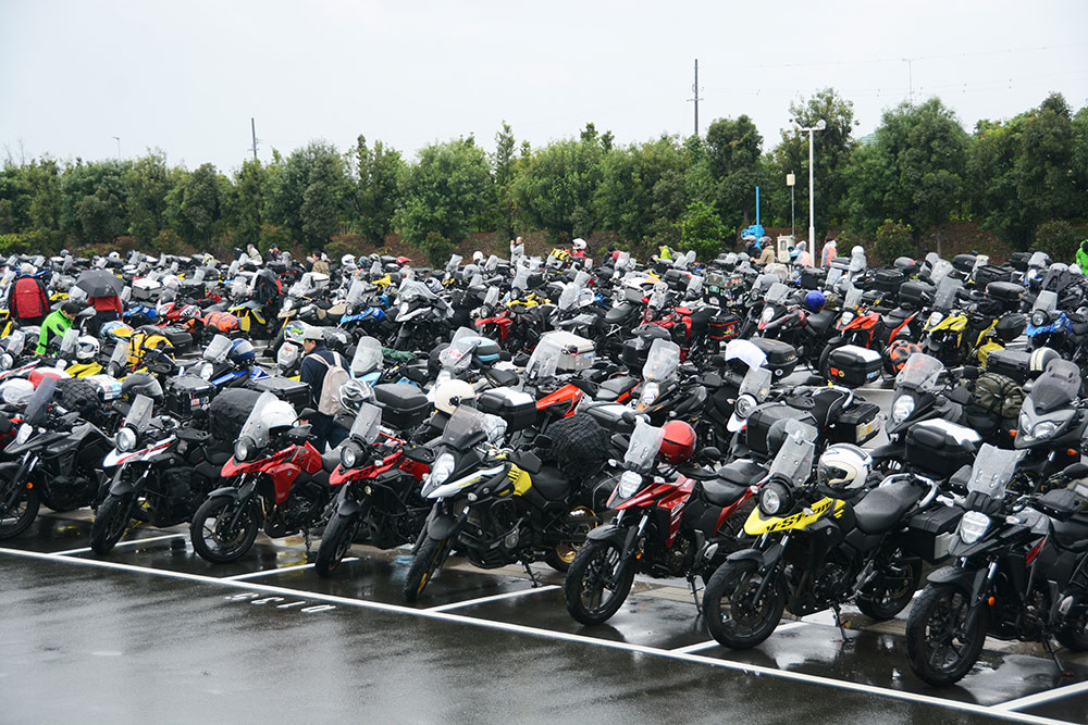 イベントの開場時間の9時に合わせて、さまざまな年式や排気量のVストロームが全国各地から続々と集まり始めました。二輪車専用駐車場は、あっという間にVストロームの展示会のような状態となりました。