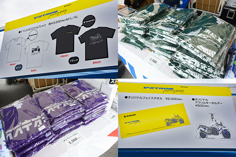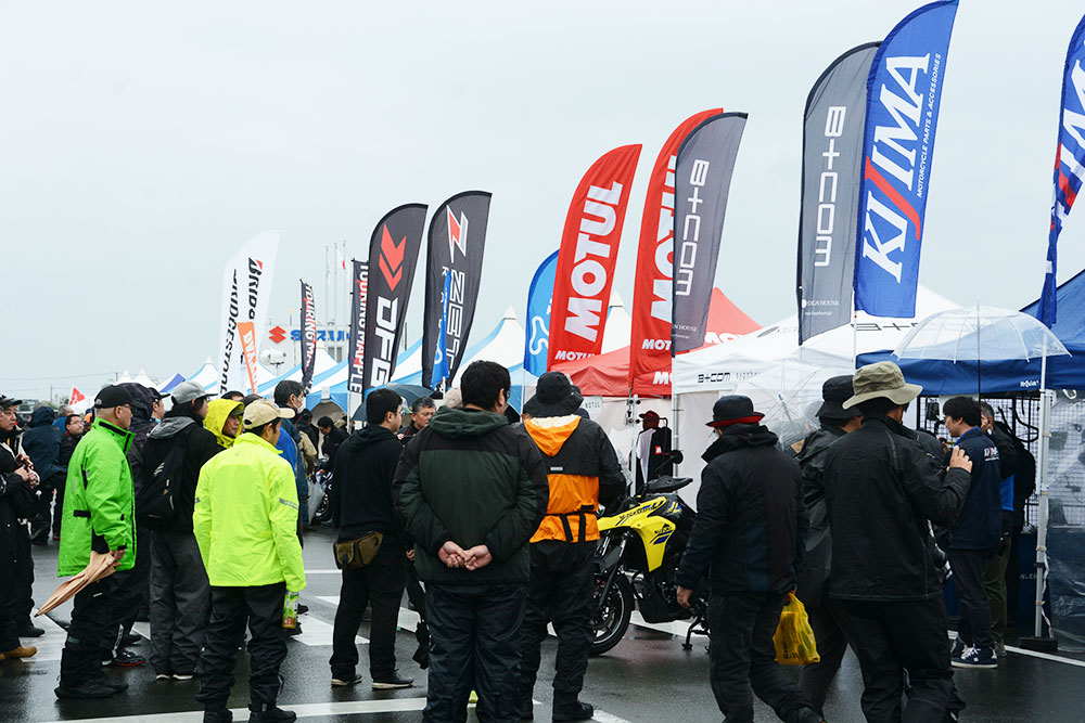 会場内には、イベント限定グッズやスズキオリジナルグッズの販売ブースをはじめ、サスペンションやタイヤなどの足まわり商品、バッテリー類、ケミカル用品、バイク用電子機器、ツーリングバッグなどを取り扱うメーカーブースが軒を連ね、大変盛況でした。